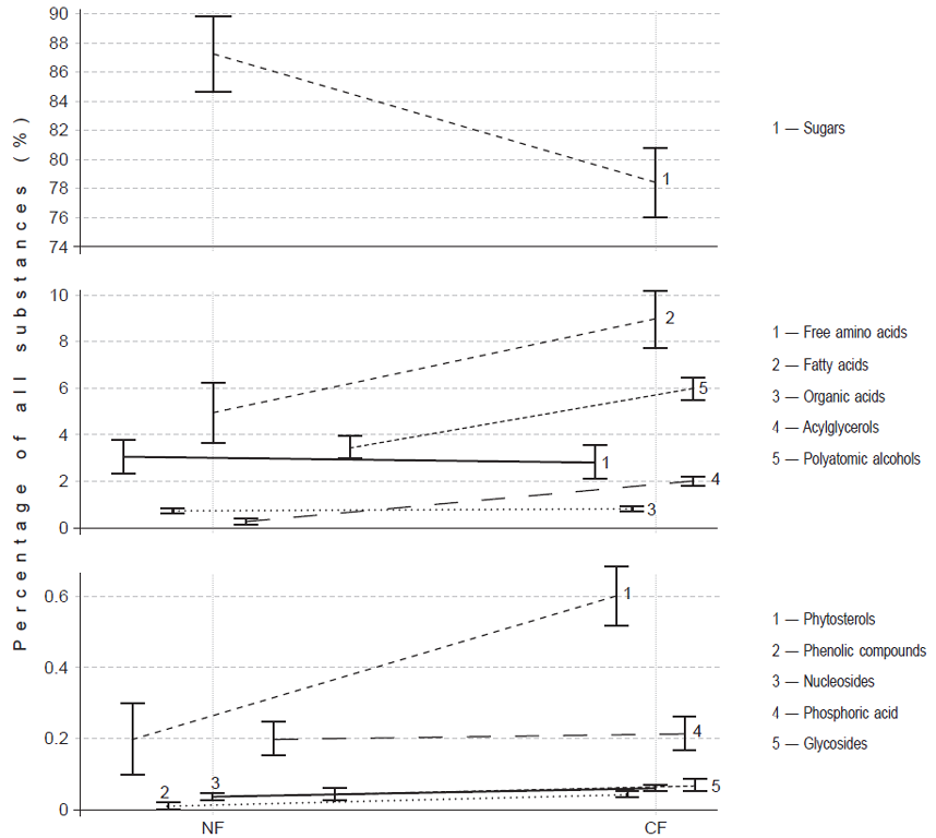 The significance of differences in metabolic profiles of NF and CF was confirmed using the Tukey criterion. Gluconic, lactic, ferulic, and aspartic acids, as well as resorcinol, glucose, sucrose, and raffinose, prevailed in CF. Malic, phosphoric, pipecolic, 5-hydroxypipecolic, palmitic, linoleic, oleic, para-coumaric, and benzoic acids; glycine; tyrosine; MAG-2 С18:2; ononytol; glycerol; myoinositol; galactinol; and isofucosterol prevailed in NF (Fig. 3).