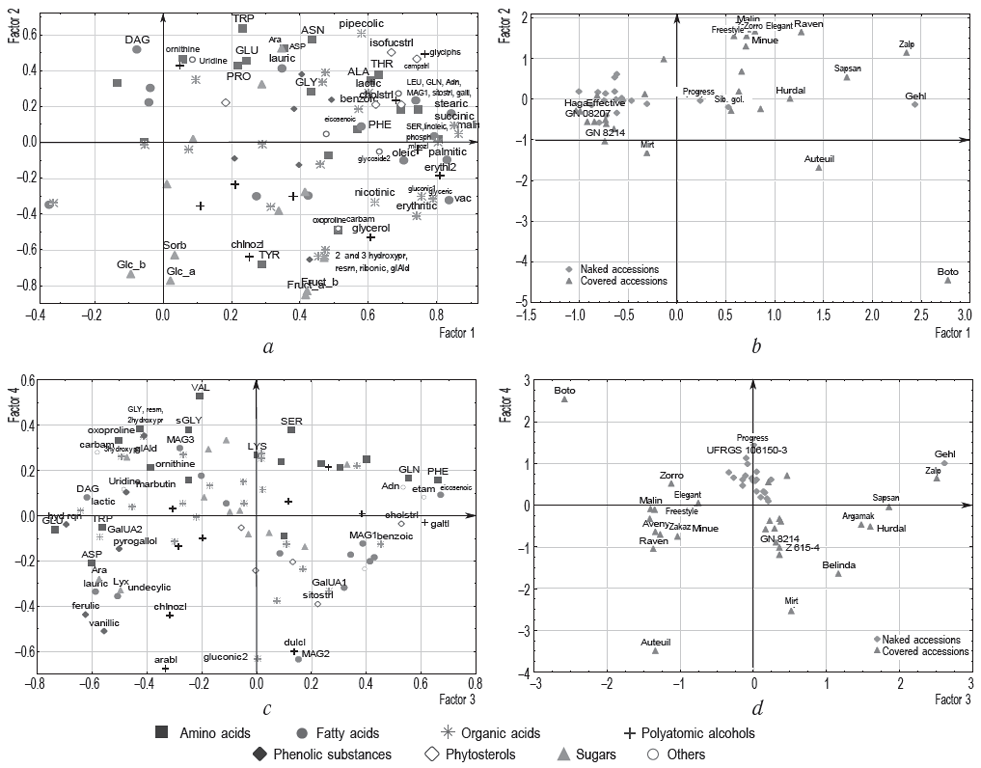 Fig. 2. Distribution of the studied compounds and accessions of oat in the two-PC system: a – substances, PC 1 and 2; b – accessions, PC 1 and 2; c – substances, PC 3 and 4; d – accessions, PC 3 and 4