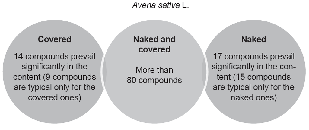 Fig. 3. Quantity of compounds typical for metabolic profiles of grains of naked and covered forms of Avena sativa L.
