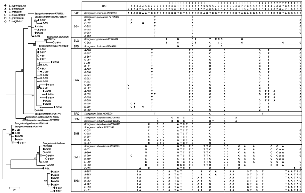 Всего нами были получены данные для пяти видов и одного гибрида. Кроме того, для сравнительного анализа из базы данных GenBank [41] были взяты последовательности следующих видов: S. emersum (KF265393), S. glomeratum (KF265386), S. gramineum (KF265381), S. fluctuans (KF265378), S. fallax (KF265376), S. subglobosum (KF265397, KF265387), S. hyperboreum (KF265396), S. natans (KF265385), S. stoloniferum (KF265395) [22].