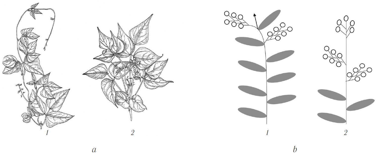 Рис. 1. Растения с разным типом роста. а — тип роста растений фасоли [17]; b — схематическое изображение. 1 — индетерминантный, 2 — детерминантный