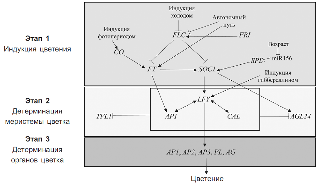 Архитектоника растения напрямую связана с функционированием апикальной меристемы побега, из которой происходит формирование большинства надземных органов растения. По мере развития растения происходит переход к цветению, при этом апикальная меристема побега дает начало меристеме соцветия и цветка. Переход от вегетативной к репродуктивной стадии развития контролируется взаимодействием положительных и отрицательных регуляторов [19, 20]. Образование самого цветка можно разделить на несколько этапов — индукция цветения, детерминация меристемы цветка и детерминация органов самого цветка (рис. 2). Индукция самого цветения представляет собой запуск генетической программы развития растения. На этом этапе в клетках растения происходит запуск каскада физиологических процессов, основой которых являются молекулярно-генетические взаимосвязи [19].