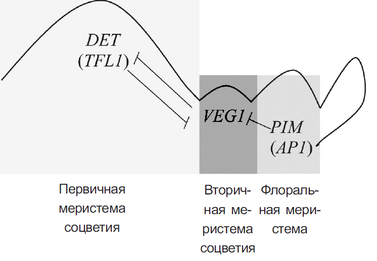 Необходимо отметить, что кроме апикальной меристемы соцветия у растений функционируют вторичные меристемы, определение идентичности которых связано с функционированием комплекса генов VEG1, GIGAS и VEG2 (см. таблицу, рис. 3). Ген VEG1 относится к группе генов AP1/SQUA/FUL и является гомологом гена AGL79 [52], контролирует определение идентичности меристем вторичных соцветий, экспрессируется после перехода растения к цветению в зоне апекса вторичных соцветий. Мутантные растения гороха veg1 не цветут, у них не происходит закладка органов цветка, заблокирован переход к стадии цветения [52]. У мутантов veg1 была отмечена экспрессия гена DET в латеральных меристемах по бокам от апикальной меристемы. Экспрессия гена VEG1 необходима для активации таких латеральных меристем путем прямого или опосредованного подавления экспрессии DET.