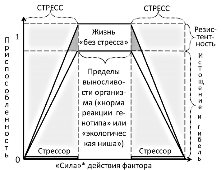 Fig. 1. Scheme about “stress” as general response of organism to environmental stressors. * force in that case means any action feature (duration, repeatability, intensity, absence of factor, etc.), which is out of common adaptability limits determined by evolution. Essential rearrangement of organism state in “stress” can change its resistance limits to stressor [15] – “norm of reaction”. That leads to lasting resistance (often with reduced level of general fitness). The end of stressor action results in the same effect (or leads to restore of an organism properties)