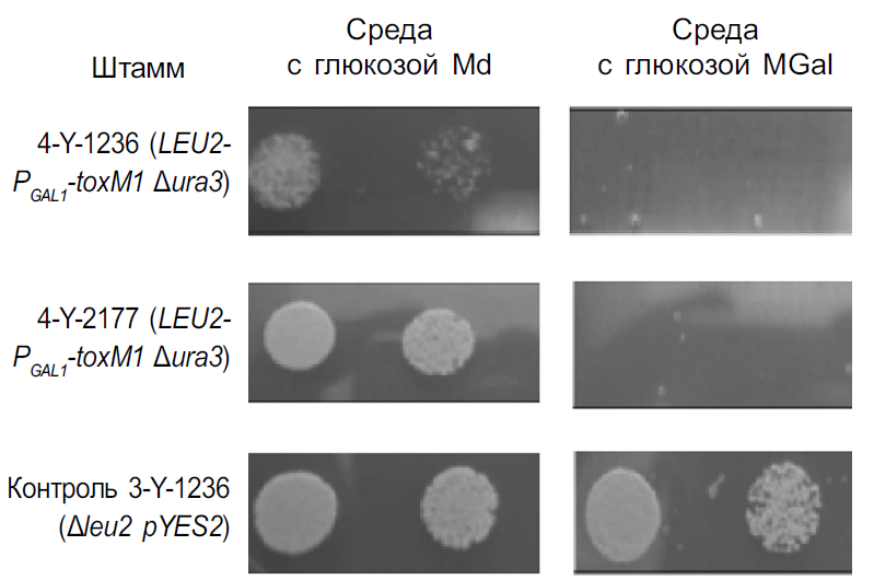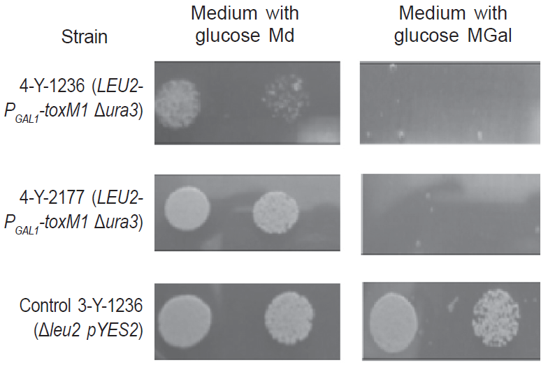 The DNA fragment of the M1 killer toxin (a-TOX 315 bp) previously used by (Gier, et al) was amplified using the primer pair а-ТОХ-F and а-ТОХ-R [24]. Consequently, we constructed the plasmid pAL2-T-PGAL1-aTOX carrying one fragment of M1 virus (a-TOX fragment) under the control of GAL1 gene promoter. This plasmid was used as a matrix, and the primer pair ScLEU2-5'-AvrII-F and ScLEU2-3'-AvrII-R was used to amplify the fragment 5'LEU2-PGAL1-aTOX-3'LEU2 3'. The resulting fragment was transformed into 3-Y-1236 and 3-Y-2177 strains, and the transformants were chosen according to their leucine prototrophy recovery. The scheme of the experiment is illustrated in figure 2, b. As a result, the two strains 4-Y-1236 (LEU2-PGAL1-toxM1 ∆ura3) and 4-Y-2177 (LEU2-PGAL1-toxM1 ∆ura3) were obtained. These two strains are characterized by conditional lethality, i.e. the strains did not grow on media containing galactose, as long as the toxin was synthesized in the cells (figure 4). The integration of the fragment into the genome was checked using PCR, with the genomes of 4-Y-1236 and 4-Y-2177 transformants as the matrix DNA and aTOX-F/aTOX-R primer pair. In case of 4-Y-1236 strain showing an insignificant inhibition of growth on the glucose-containing medium, this may be due to the peculiarities of the regulation of glucose repression in this strain. For our further work we used 4-Y-2177 strain.