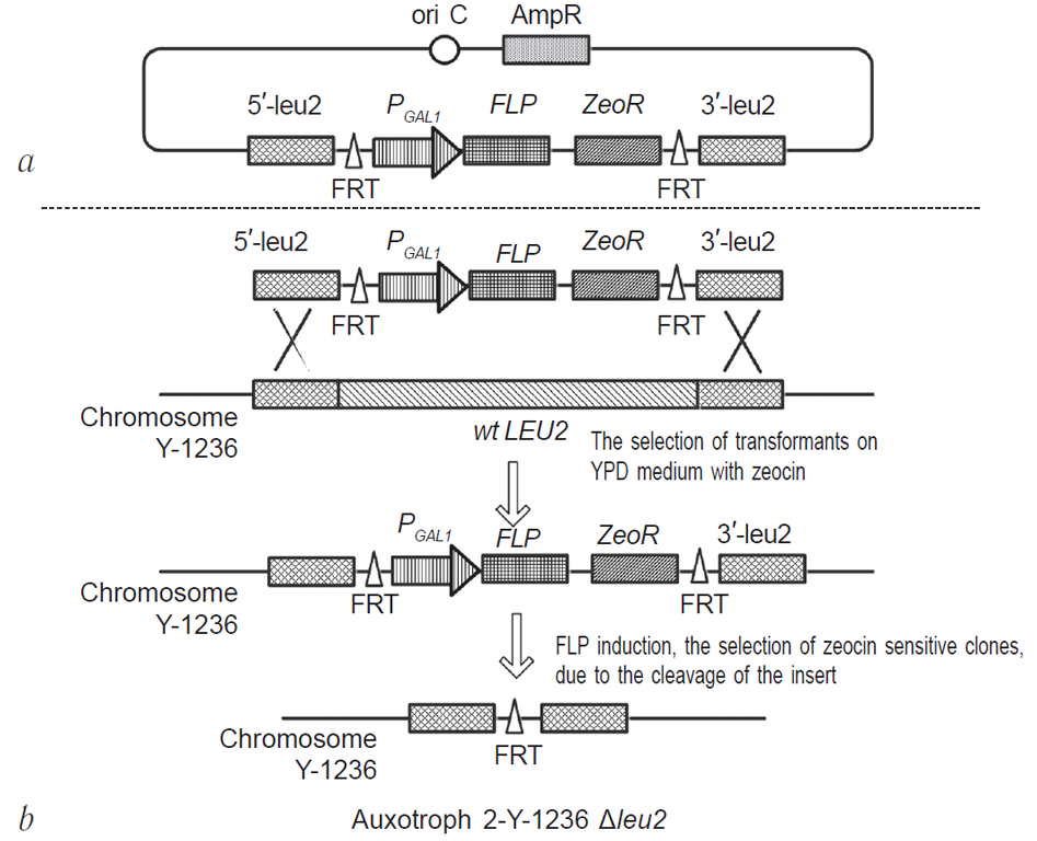Fig. 1. Scheme for obtaining S. cerevisiae strains with deletions in LEU2 и URA3 genes: a – structure of plasmid pAL2T-delleu2; b – obtaining the auxotrophic strain 1-Y-1236 (Δleu2) using the FLP-FRT recombination system (strains 2-Y-1236 (Δura3), 1-Y-2177 (Δleu2) and 2-Y-2177 (Δura3) were obtained similarly). Auxotrophic strains to leucine and uracil 3-Y-1236 (Δleu2 Δura3) and 3-Y-2177 (Δleu2 Δura3) were obtained using strains with a single auxotrophy