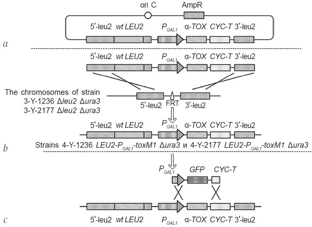 Fig. 2. Scheme of M1 toxin fragment integration into the genomes of S. cerevisiae strains and its use as a selection marker: a – structure of plasmid pAL2-T-PGAL1-αTOX; b – obtaining the 4-Y-1236 (LEU2-PGAL1-toxM1 Δura3) and 4-Y-2177 (LEU2-PGAL1-toxM1 Δura3) strains in the genome of which the toxin sequence of the M1 virus was integrated under the control of the regulated promoter of GAL1 gene; c – integration of the GFP gene flanked by sequences homologous to the promoter of the GAL1 gene and the termination region of the CYC1 gene
