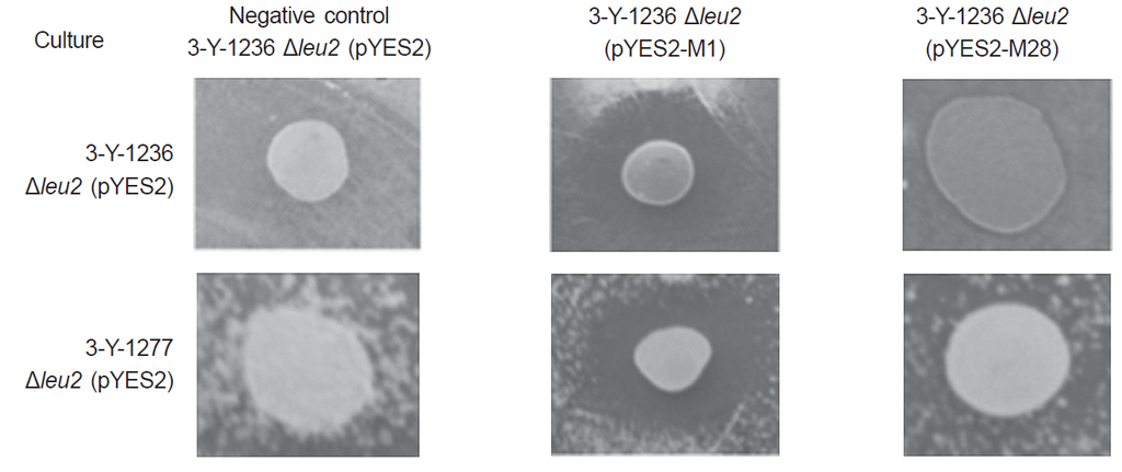 Fig. 3. Phenotypes of strains 3-Y-1236 (Δleu2 pYES2-M1) and 3-Y-1236 (Δleu2 pYES2-M28) on a medium with lawns of the control strains 3-Y-1236 (Δleu2 pYES2) and 3-Y-2177 (Δleu2 pYES2). The inhibition zone is the result of the killer toxins action