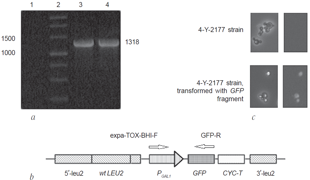 Fig. 5. Evaluation of GFP gene integration in transformants genome: a – results of PCR with expaTOX-BHI-F and GFP-R primers and genomic DNA of 1) 4-Y-2177 strain; 3) 4-Y-2177 strain transformed with GFP fragment, clone 1; 4) 4-Y-2177 strain transformed with GFP fragment of clone 2. The sizes of the fragments correspond to the theoretically expected 1343 bp. 2) Evrogen DNA length marker 1 kb; b – scheme representing the location of primers; c – fluorescence microscopy results of the transformed cells in comparison to untransformed 4-Y-2177 strain