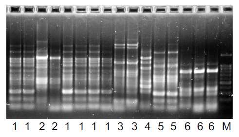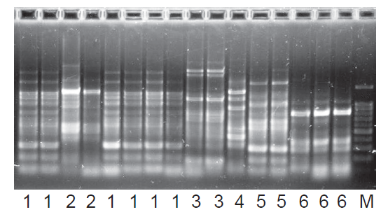 Генетическое разнообразие собранных штаммов исследовали с помощью RAPD-анализа (Random Amplified Polymorphic DNA) [7] с использованием следующих «случайных» праймеров: 1) 5′-gggcgctg-3′; 2) 5′-caggcccatc-3′; 3) 5′-gcgtccattc-3′. Данный анализ также позволил сократить количество образцов, за счет объединения микроорганизмов с идентичными RAPD-профилями в гомогенные группы, из которых в последующем в работу брали только по одному образцу.