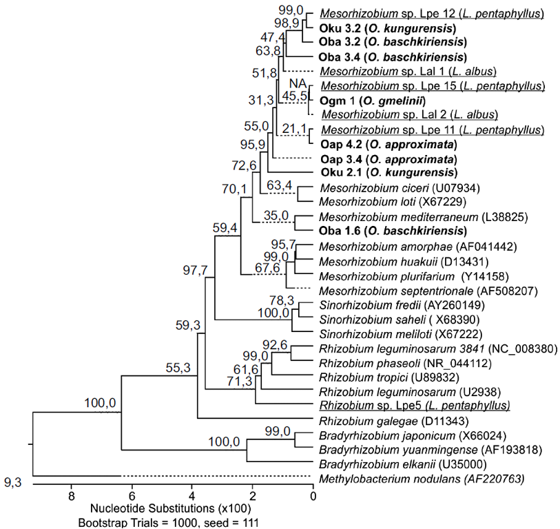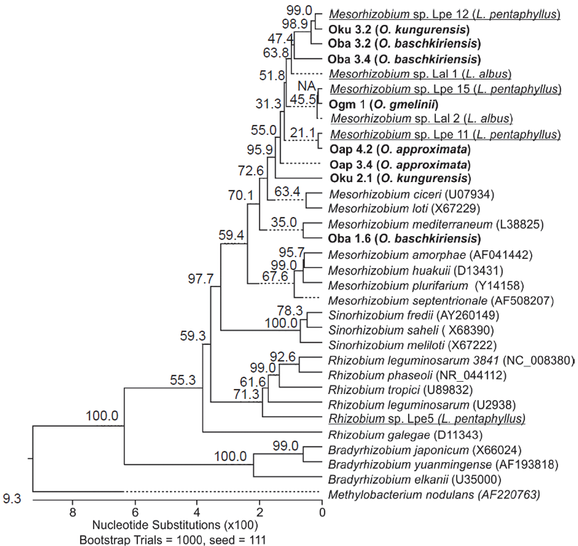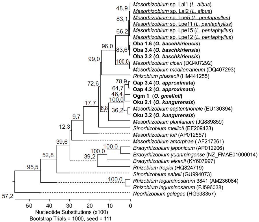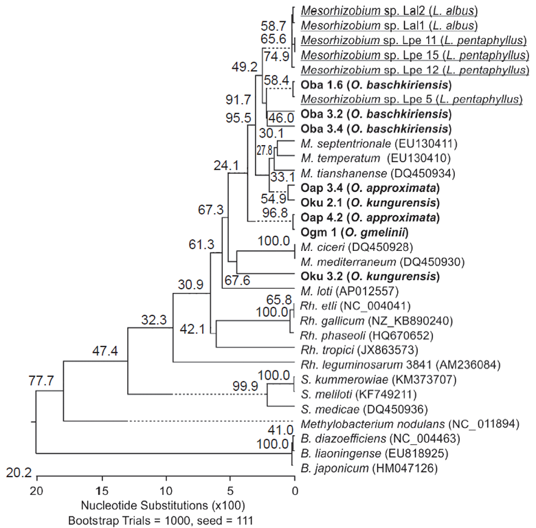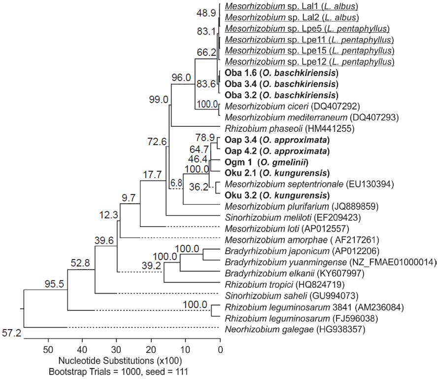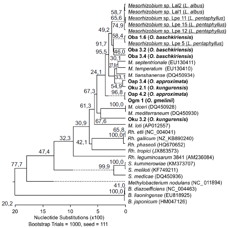 Предварительный филогенетический анализ, проведенный посредством 16S-ПДРФ, выявил, что штаммы образуют, в свою очередь, 8 монофилетических групп. Соответственно, штаммы ризобий из клубеньков O. kungurensis образовали 2 группы, O. baschkiriensis s. l. — 3, O. approximata — 2, и O. gmelinii — 1 монофилетическую группу.