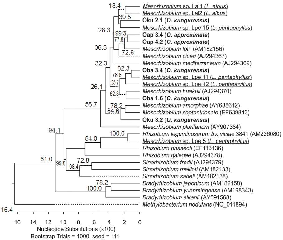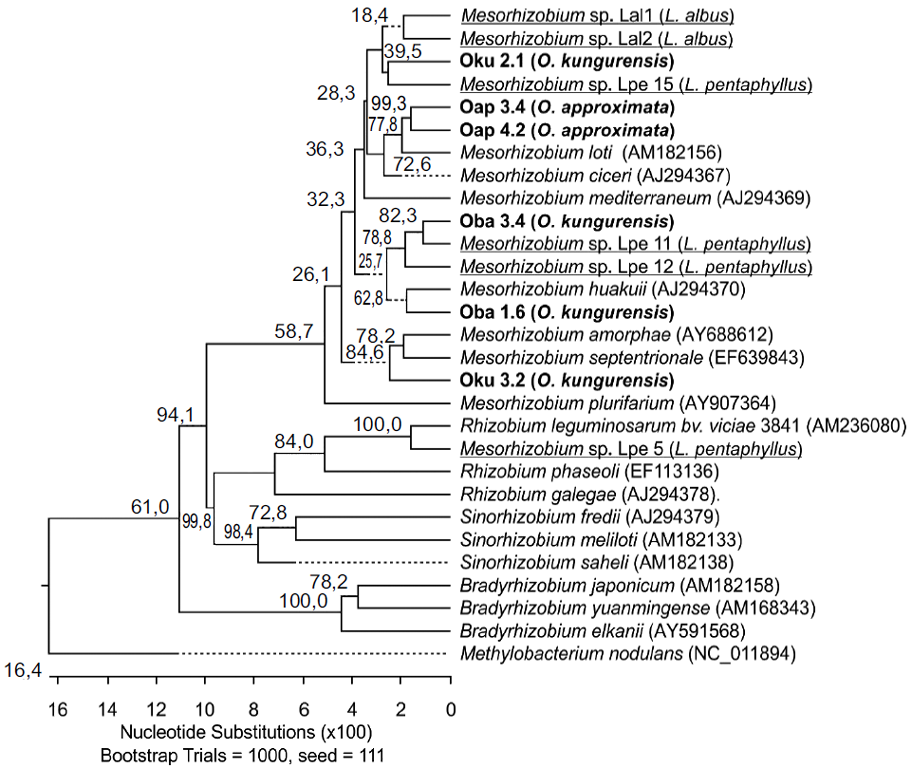 Исследование филогении гена nifH всех анализируемых бактерий показало их близость с аналогичными генами, преимущественно обнаруживаемыми у бактерий рода Mesorhizobium. При этом различия в нуклеотидных последовательностях nifH всех анализируемых бактерий были весьма незначительные. Наибольшая разница обнаружена между последовательностями гена nifH двух штаммов Oku 3.2 и Oku 2.1, вступающих в симбиоз с растениями O. kungurensis. Тем не менее схожесть между ними составила 92 %, что говорит о консервативности генов нитрогеназы данных бактерий.