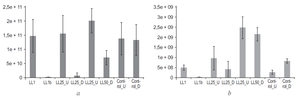 Рис. 1. Количество копий гена 16S рРНК бактерий (а) и архей (b) в техноземах (LL1 и LL1LL1b) и эмбриоземах (LL25–50) отвалов Kурской магнитной аномалии, а также в контрольной почве (control_U, control_D)