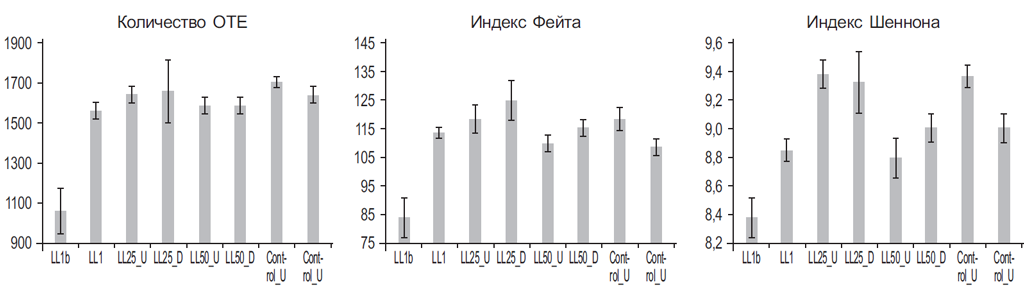 Альфа-разнообразие оценивали посредством расчета количества OTЕ, а также индексов Фейта (филогенетическое разнообразие) и Шеннона. Достоверность различий в показателях альфа-разнообразия среди микробиомов оценивали с помощью t-критерия. Для анализа бета-разнообразия (оценки процента сходств/различий между микробиомами) использовали метод Weighted Unifrac [15]. Достоверность различий в наличии отдельных таксонов оценивалась с помощью нескольких парных тестов таблиц сопряженности частот OTЕ. Алгоритм динамически выбирает либо G-критерий, либо точный критерий Фишера и применяет коррекцию p-значения Бонферрони.