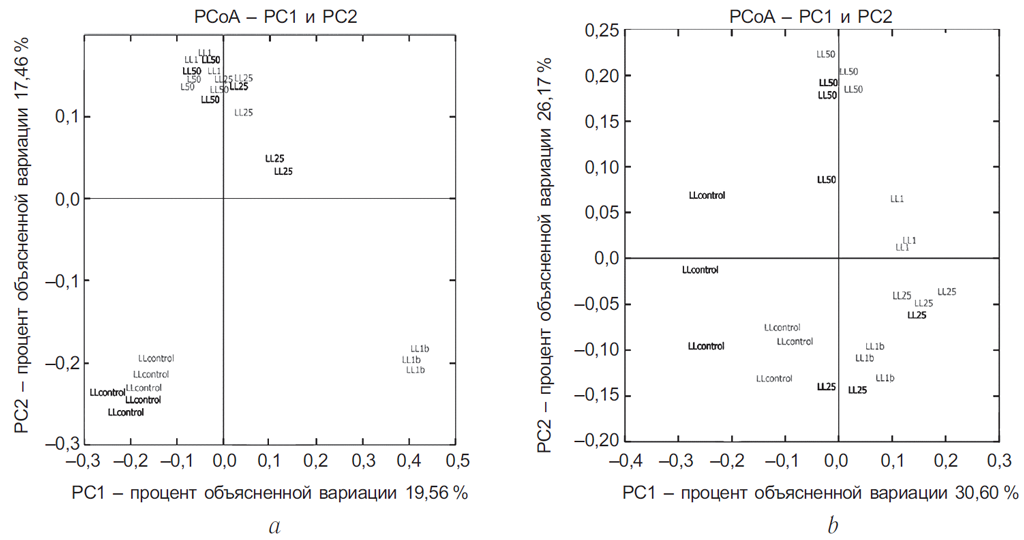 Многомерное шкалирование бета-разнообразия показало группирование образцов в три основных кластера — почву без растительности, контрольные образцы и образцы технозема с растительным покровом LL1, 25, 50 (рис. 3, а, b). Таким образом, наличие растений явилось существенным фактором формирования почвенного микробиома в техногенных отвалах. Однако различие микробных сообществ, соответствующее определенной глубине, было отмечено только для более молодых отвалов (LL25). Выявлена бóльшая неоднородность нижних (5–10 см) слоев, наблюдаемая с возрастом, по сравнению с верхними (0–5 см) слоями (рис. 3, b), что можно объяснить началом формирования почвы в варианте LL25.