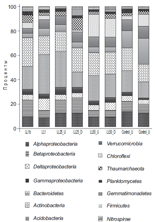 Содержание Thaumarchaeota относительно возросло в варианте LL50 (максимальное содержание в LL50_U 10,2 %) и в контрольных образцах. Вариант LL50 характеризовался более высоким содержанием Zn, который известен своим ингибирующим воздействием на микроорганизмы [7, 10]. Таким образом, этот элемент оказывает косвенное влияние на количество архей путем замещения ими экологических ниш, ранее занимаемых бактериями. Предыдущие исследования показали, что многие архейные группы характеризовались олиготрофной стратегией и могли выиграть конкуренцию за экологические ниши у бактерий в условиях энергетического стресса [20].