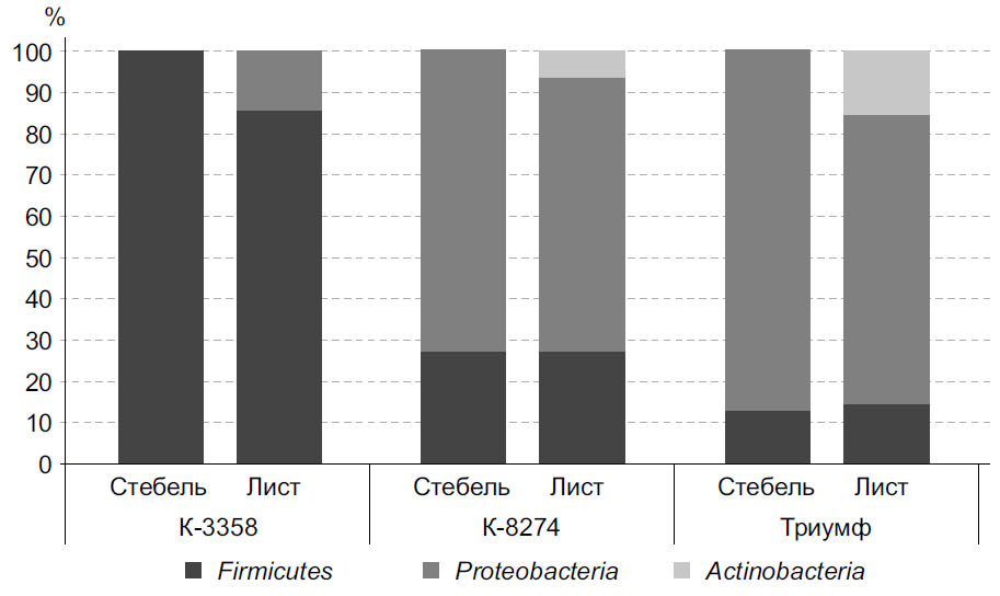 В стеблях и в листьях «отзывчивого» генотипа К-8274 доминировали эндофитные бактерии филы Proteobacteria, представленной семействами Bradyrhizobiaceae, Yersiniaceae, Enterobacteriaceae, Oxalobacteraceae, Ralstoniaceae и Sphingomonadaceae. Фила Firmicutes была второй по представленности как стеблей, так и листьев в эндофитном сообществе К-8274. Кроме того, в листьях растений К-8274 были найдены эндофитные бактерии, принадлежащие к филе Actinobacteria (рис. 3).