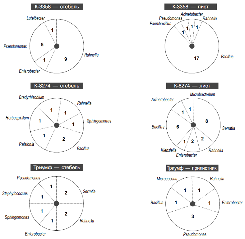 Рис. 3. Представители эндофитного сообщества растений гороха. На диаграммах показано количество представителей различных родов бактерий