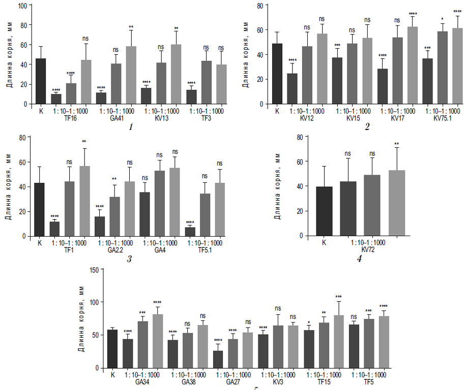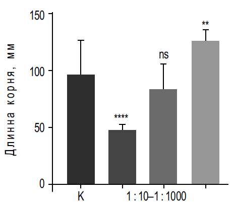 Рис. 5. Результаты повторного теста KV17 на ростостимулирующую активность. Достоверность отличия длины корней растений от контроля: ** p < 0,01; **** p < 0,0001; ns — отсутствие достоверных различий