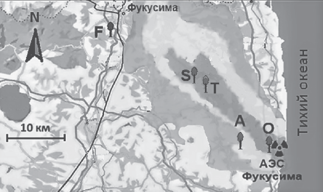 We studied pine populations from areas contaminated with radionuclides as a result of the accident at the Fukushima nuclear power plant (Fig. 1). The average age of most trees in the populations studied was 5–8 years at the time of sampling. A plant population from the territory of the University of Fukushima (F) was selected as a control. In the contaminated areas, plant populations from the Akibadai (A), Tsushima Farm (T), Tsushima School (S), and Okuma (O) sites were studied. Three types of trees were identified in each population, namely those with impaired apical dominance (FA, AA, SA, TA, OA); those that had recovered following impairment of apical dominance (FR, AR, SR, TR, OR), and those without morphoses (FN, AN, SN, TN, ON). The share of abnormal trees in the population is presented in Table 1.