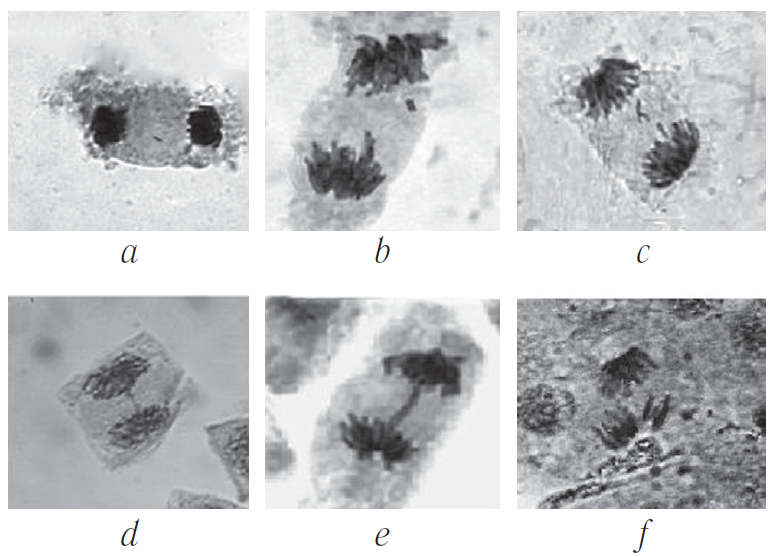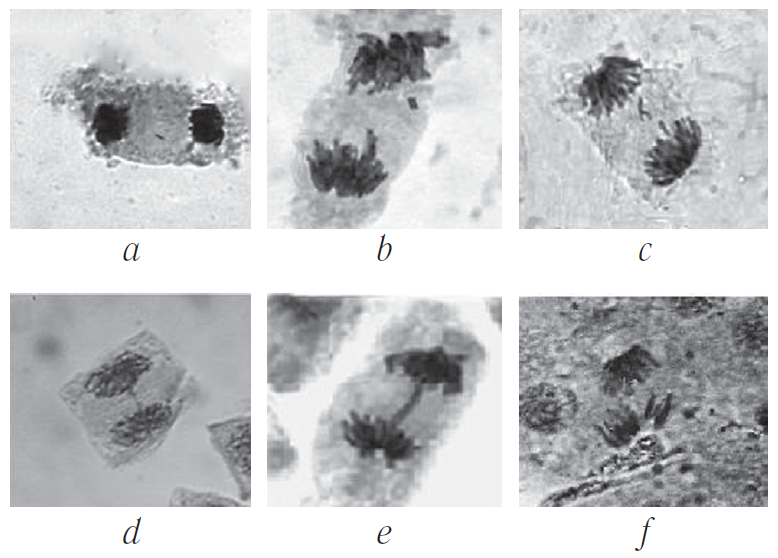 Figure: 2. Anomalies of mitosis in the intercalary meristem of red Japanese pine needles: a - single fragment; b - double fragment; c - lagging behind; d - single bridge; e - double bridge; f - multipolar mitosis