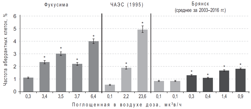 Figure: 3. Frequency of cytogenetic disturbances in populations of red Japanese pine (this study) and populations of Scots pine from the 30-km zone of the Chernobyl nuclear power plant [19] and the Bryansk region [14]. The difference from the control is statistically significant: * p <0.05