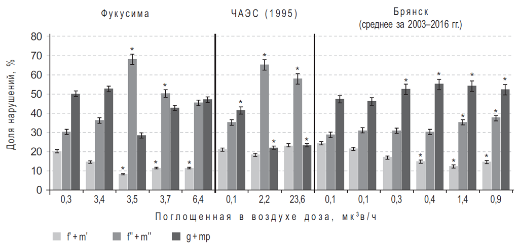 Figure: 4. The spectrum of cytogenetic disturbances in the populations of red Japanese pine (this study) and Scots pine from the 30-km zone of the Chernobyl nuclear power plant [19] and the Bryansk region [11]. f ', m' - chromatid (single) fragments and bridges; f '', m '' - chromosomal (double) fragments and bridges; g - lagging chromosomes; mp - multipolar mitoses. The difference from the control is statistically significant: * p <0.05