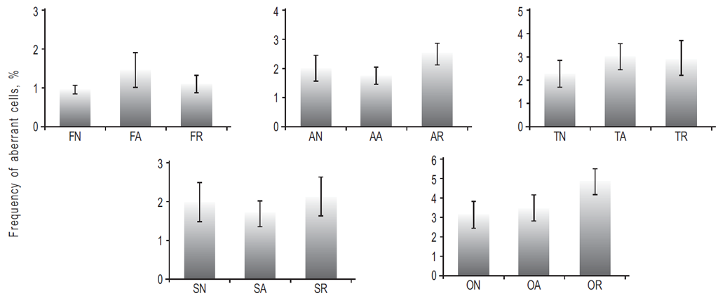 Figure: 5. The relationship between the frequency of cytogenetic effects and disorders of apical dominance. On the abscissa axis of the tree group: with impaired apical dominance (FA, AA, SA, TA, OA); recovered (FR, AR, SR, TR, OR); without morphoses (FN, AN, SN, TN, ON)