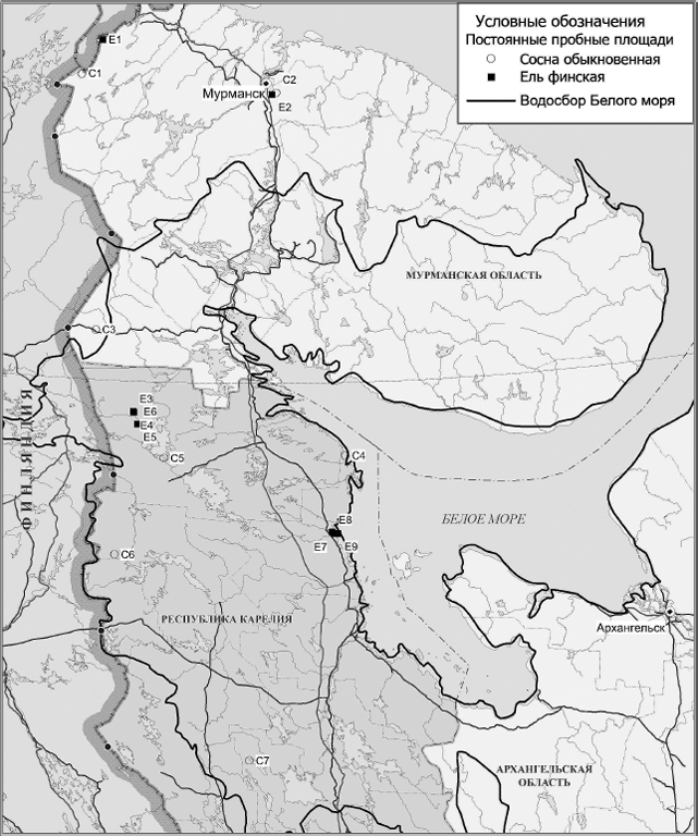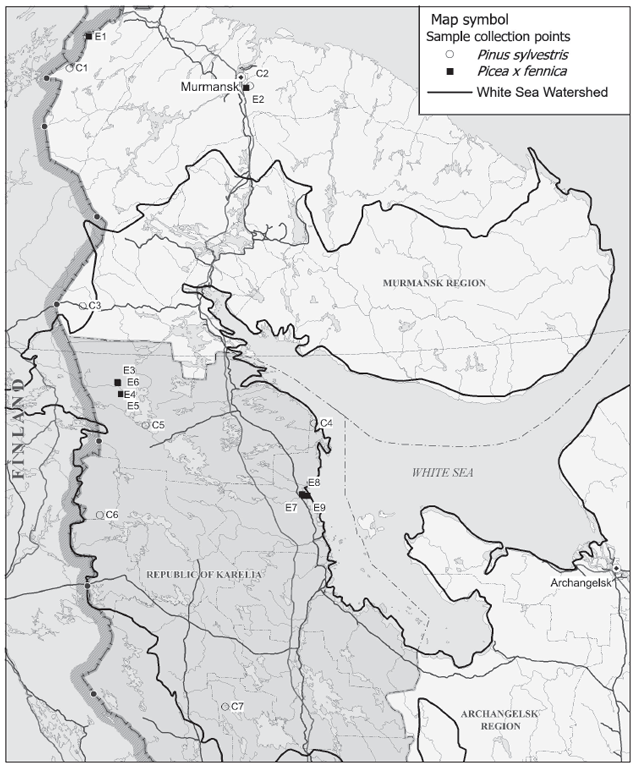 Permanent sample plots (PSP, Fig. 1) were established in natural pine forests and spruce forests within the western part of the White Sea catchment basin (northern taiga subzone of Karelia and Murmansk oblast). Table 1 presents the characteristics of the populations.