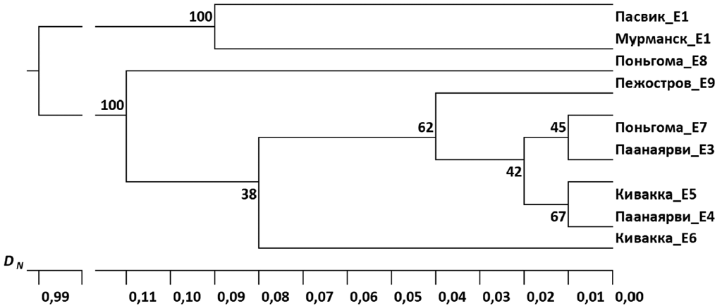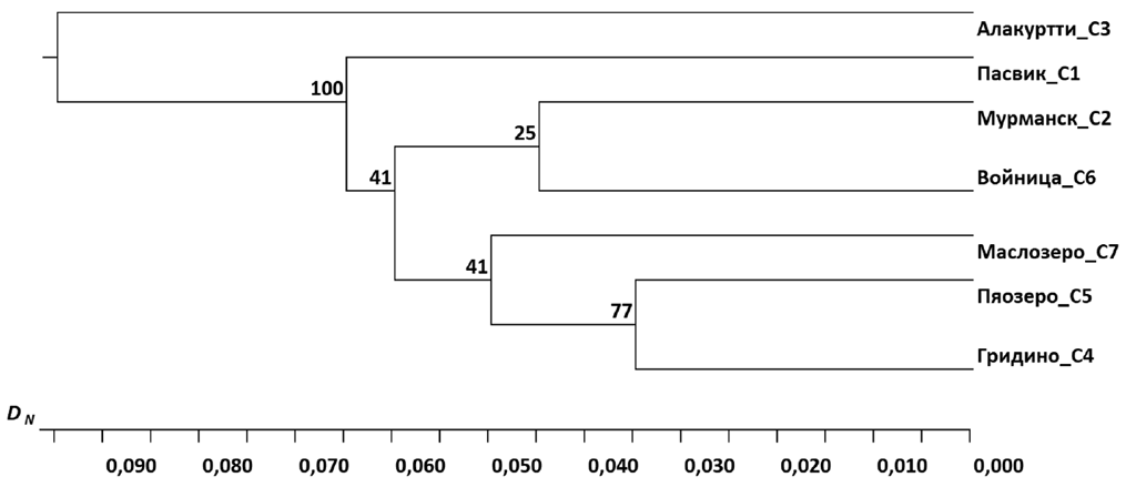 Это подтверждается дендрограммой сходства, построенной с помощью метода UPGMA на основе матрицы генетических дистанций по Неи (рис. 3). В основную группу (DN от 0,04 до 0,07) вошли с достоверной вероятностью (BP = 100 %) все популяции сосны обыкновенной — и периферические, и северотаежные, за исключением Алакутти_С3, генетическое расстояние с которой у остальных популяций оказалось максимальным (DN = 0,09). Одной из причин относительно высокой генетической обособленности этой популяции может быть небольшой размер выборки (n = 13).