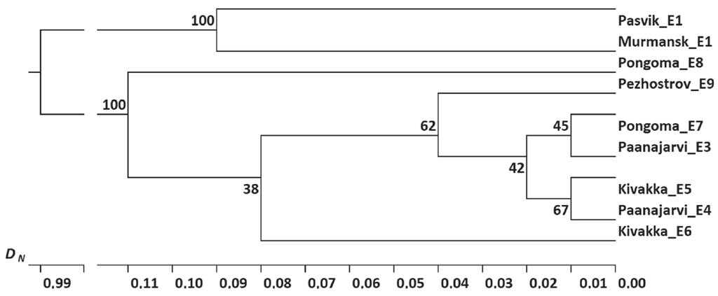 Fig. 3. Dendrogram of the similarity of the Karelian populations of P. sylvestris by the Nei genetic distance (DN); bootstrap probabilities BP (%) are indicated in the nodes of the dendrogram
