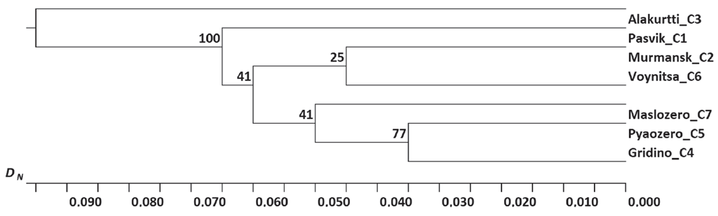 These results were confirmed by the similarity dendrogram constructed using the UPGMA method based on the Nei genetic distance matrix (Fig. 3). The main group (DN = 0.04–0.07) included with a significant probability (BP = 100%) all populations of Scotch pine, both peripheral and northern taiga, with the exception of Alakutti_C3, whose genetic distance from the rest of the populations turned out to be maximum (DN = 0.09). One of the reasons for the relatively high genetic isolation of this population may be the small sample size (n = 13).