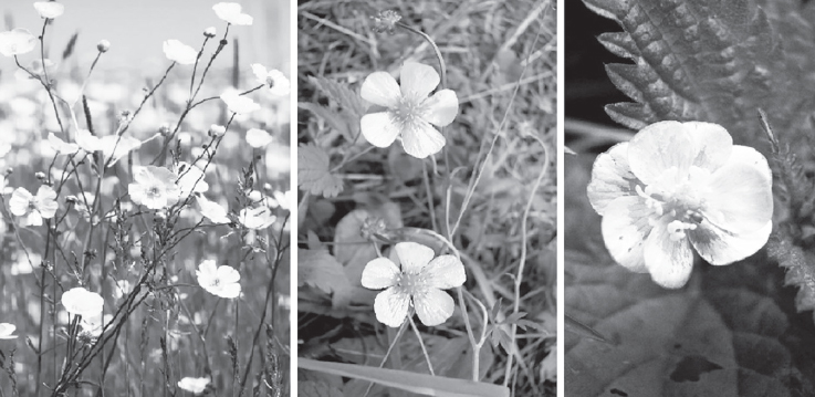 Рис. 1. Общий вид ветвления растений (слева), нормальные (середина) и махровый (справа) цветы лютика едкого