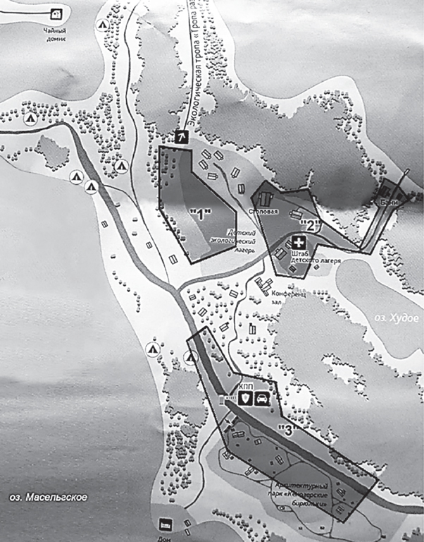Рис. 2. Схема расположения анализируемых популяций лютика едкого на территории детского экологического лагеря в Кенозерском национальном парке (Масельга, Архангельская обл.). Районы анализируемых популяций затемнены