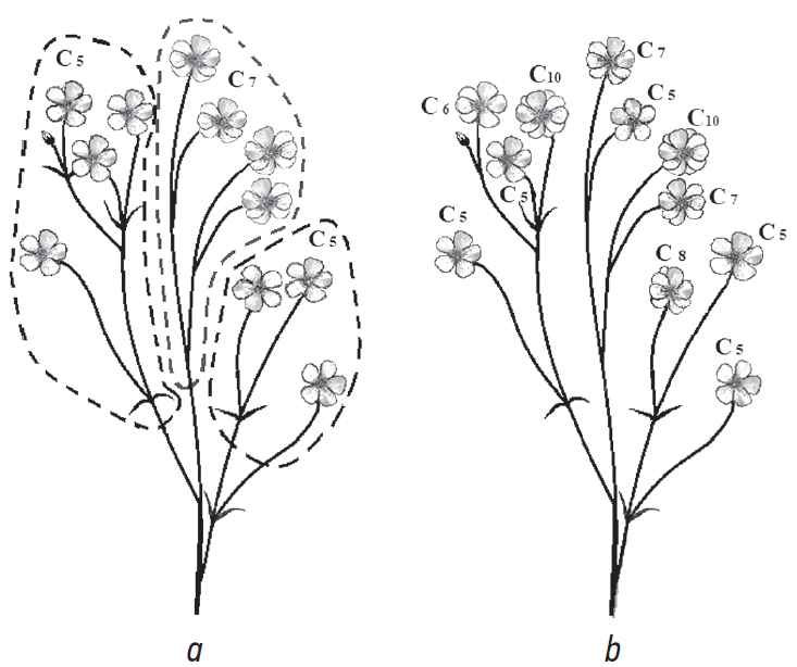 Fig. 3. Distribution examples of double flowers (Сn — the number of petals) on the stem of a buttercup plant: а — location on the branches; b — degree of terry