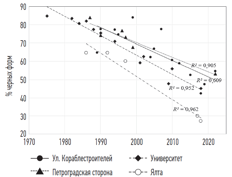 Таким образом, во всех представленных здесь петербургских популяциях за время наблюдений произошло значительное снижение доли меланистов. То же самое наблюдается и в Ялте (табл. 4, рис. 1).