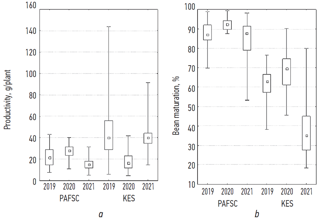 Fig. 2. Agrobiological indicators of 30 samples of peanuts grown at the Caspian Agrarian Federal Scientific Center and at the Kuban Experimental Station in 2019–2021: a — productivity; b — ripening of beans. Shown are: minimum, maximum values, quantiles, median