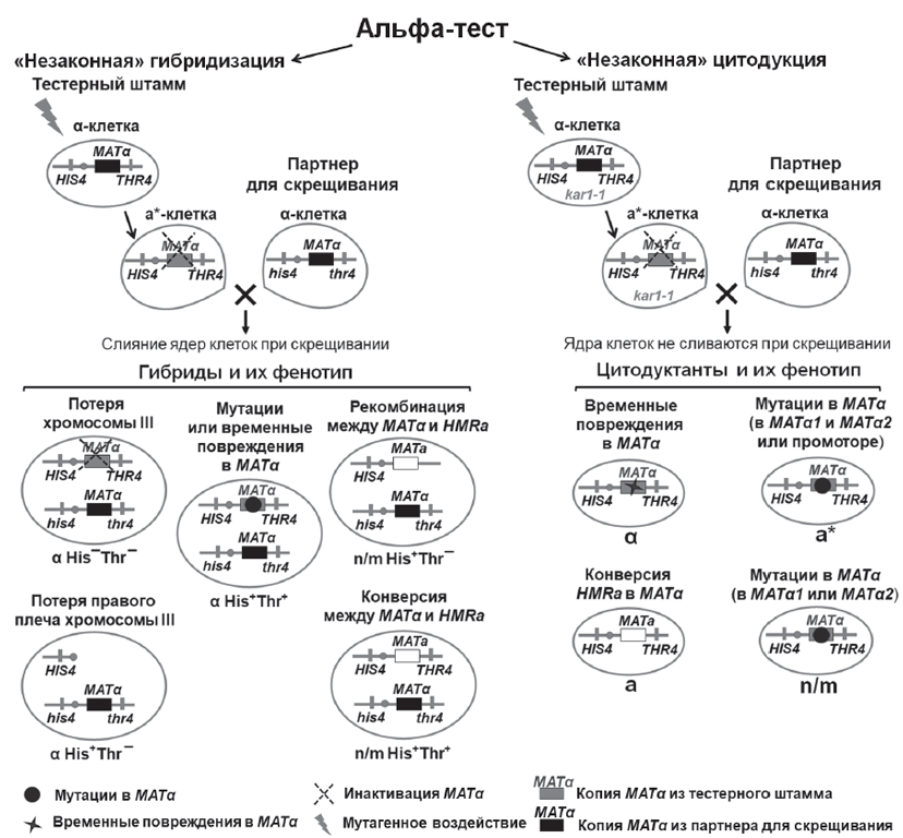 Для выявления всех событий, приводящих к нарушению экспрессии локуса МАТа, альфа-тест проводят в двух взаимодополняющих вариантах: «незаконная» гибридизация и «незаконная» цитодукция. В системе «незаконной» гибридизации можно оценить частоту потери целой хромосомы III и ее правого плеча, конверсии и рекомбинации, а также частоту генных мутаций и временных повреждений локуса МАТα, учитываемых совместно. Для того чтобы определить частоту генных мутаций и частоту временных повреждений в локусе МАТα в отдельности, необходимо проводить альфа-тест в системе «незаконной» цитодукции. Для того чтобы выяснить, какое из перечисленных генетических событий привело к переключению типа спаривания α → а, необходимо проанализировать фенотип возникших «незаконных» гибридов и цитодуктантов (рис. 1). Определив частоту всех фенотипических классов гибридов и цитодуктанов, учитываемых в альфа-тесте, можно количественно оценить долю тех первичных повреждений ДНК, которые были устранены безошибочно, но за время своего существования в клетке успели повлиять на ее фенотип (привести к временному переключению типа спаривания α → а), и долю тех первичных повреждений, которые закрепились в виде мутаций, привели к потере хромосомы III или ее правого плеча, а также индуцировали генную конверсию и рекомбинацию. Подробнее теоретические основы альфа-теста описаны в наших предыдущих работах [2, 5–7].