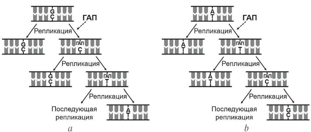 Рис. 2. Включение 6-N-гидроксиламинопурина (ГАП) в ДНК при репликации и механизм возникновения генных мутаций (транзиций): а — замен GC → АТ; b — замен AT → GC