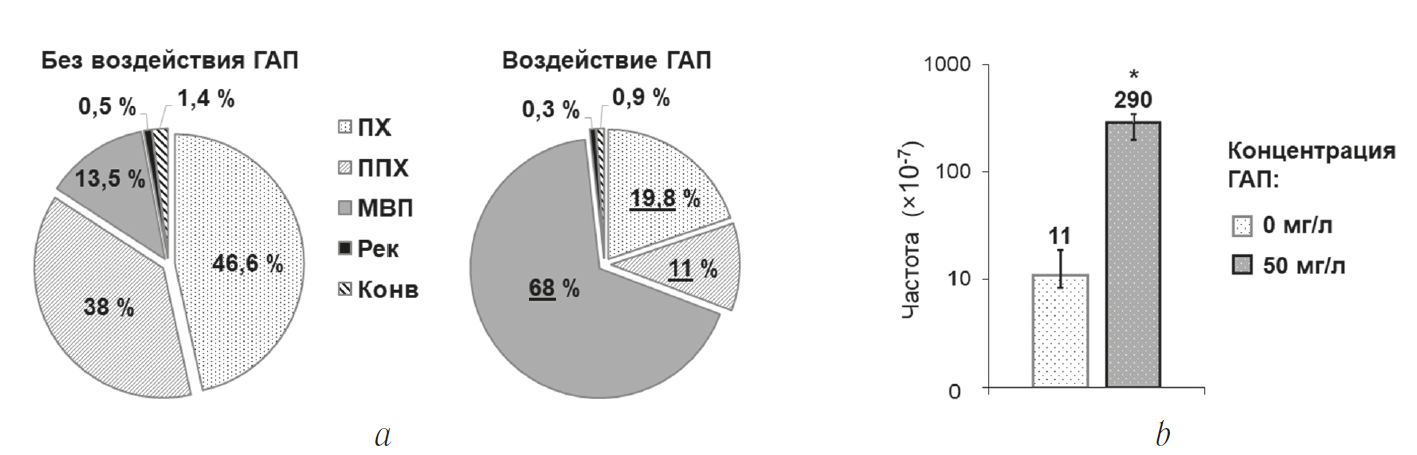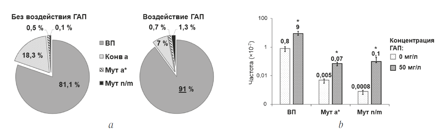 Рис. 4. Распределение классов генетических событий, выявляемых в тесте на «незаконную» цитодукцию, в процентом соотношении, возникших спонтанно и при воздействии ГАП (а) и частота спонтанных и индуцированных ГАП наследуемых и ненаследуемых изменений генетического материала в тесте на «незаконную» цитодукцию (b). ВП — временные повреждения в локусе MATα (одновременно в MATα1 и MATα2, или в двустороннем промоторе); Конв. — конверсия кассеты HMRa в локус MATα; Мут а* — мутации одновременно в MATα1 и MATα2, или в двустороннем промоторе, делеции MATα); Мут. n/m — мутации в MATα1 или MATα2; * — значения статистически значимо отличаются от частоты тех же событий, возникающих спонтанно, по критерию Манна – Уитни (p < 0,0001). Подчеркиванием отмечено статистически значимое изменение доли класса генетических событий после обработки ГАП по сравнению с соответствующей долей спонтанных событий по Z-критерию
