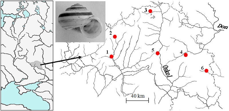 Введение Пространственная генетическая дифференциация является важным маркером состояния природных популяций в изменчивых условиях среды [21]. Так, с увеличением биотопического разнообразия в популяции формируются устойчивые в пространстве и времени внутрипопуляционные группировки (демы, или субпопуляции), каждая из которых адаптируется к локальным условиям [3, 4, 14]. Это значительно увеличивает жизнеспособность популяции и способствует ее дальнейшему выживанию. При этом ключевым моментом в формировании структуры можно считать появление генетической обособленности демов, что является прямым следствием нарушения панмиксии и приводит к временной стабилизации внутрипопуляционной структуры. Высокоагрегированный тип пространственной структуры и низкая миграционная активность делают наземных моллюсков хорошими модельными объектами при исследовании внутрипопуляционной структурированности [6]. В настоящее время известны исследования микропространственной генетической структуры на примере таких моллюсков, как Trochoidea geyeri (Soos, 1926) по RAPD-маркерам [23], Pomatias elegans (Müller, 1774) по изоферментам [22], Helix aspersa (Müller, 1774) по изоферментам и микросателлитам [16, 17, 24], Brephulopsis bidens (Krynicky, 1883) по изменчивости конхиологических признаков [5, 19] и др. Тем не менее многие вопросы генетической структурированности популяций наземных моллюсков остаются открытыми. В частности, одним из наиболее актуальных направлений является оценка дифференциации популяционных генофондов редких и уязвимых видов моллюсков, которая может стать важной частью работ по сохранению и восстановлению их популяций. В этом отношении особого внимания заслуживают популяции ксерофильного моллюска Helicopsis striata, обитающего в условиях пересеченного ландшафта юга Среднерусской возвышенности и охраняемого на территории Белгородской области России [13]. Цель исследования: провести анализ микропространственной дифференциации генетической структуры популяций H. striata, обитающих в гетерогенных условиях юга Среднерусской возвышенности. Материалы и методы Исследование внутрипопуляционной дифференциации генофонда H. striata проводили в осенние периоды 2011 и 2012 гг. Для этого на территории юга Среднерусской возвышенности было выбрано шесть модельных популяций (рис. 1), приуроченных к биотопам с разными ландшафтно-климатическими условиями (табл. 1). В каждой популяции H. striata на равном удалении через 150-200 м было заложено по пять экспериментальных площадок площадью 25 м2 каждая, в пределах которых осуществляли сбор особей. В связи с относительно большим расстоянием между точками сбора полагали, что каждая площадка соответствует отдельному дему. Таким образом, было исследовано 30 демов из 6 популяций H. striata. Экстракцию изоферментов проводили из ноги моллюска. Далее проводили диск-электрофорез изоферментов в 10 %-м полиакриламидном геле (камера VE-3, Helicon). Окрашивание блоков на выявление неспецифических эстераз осуществляли в субстратной смеси: трис-HCl (рH = 7,4), α-нафтилацетат, прочный красный TR; для выявления супероксиддисмутаз - калий-фосфатный буфер (рH = 7,8), НТС, ФМС. Необходимо отметить, что со времени первых публикаций по генетике H. striata [10, 12] нами были получены новые данные по изменчивости генофондов популяций этого моллюска и характере аллельного разнообразия локусов аллозимов. Так, в ранее использу