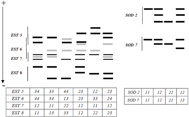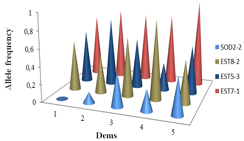 Fig. 3. The graphic image of the investigated allozyme loci and their associated combinations of alleles