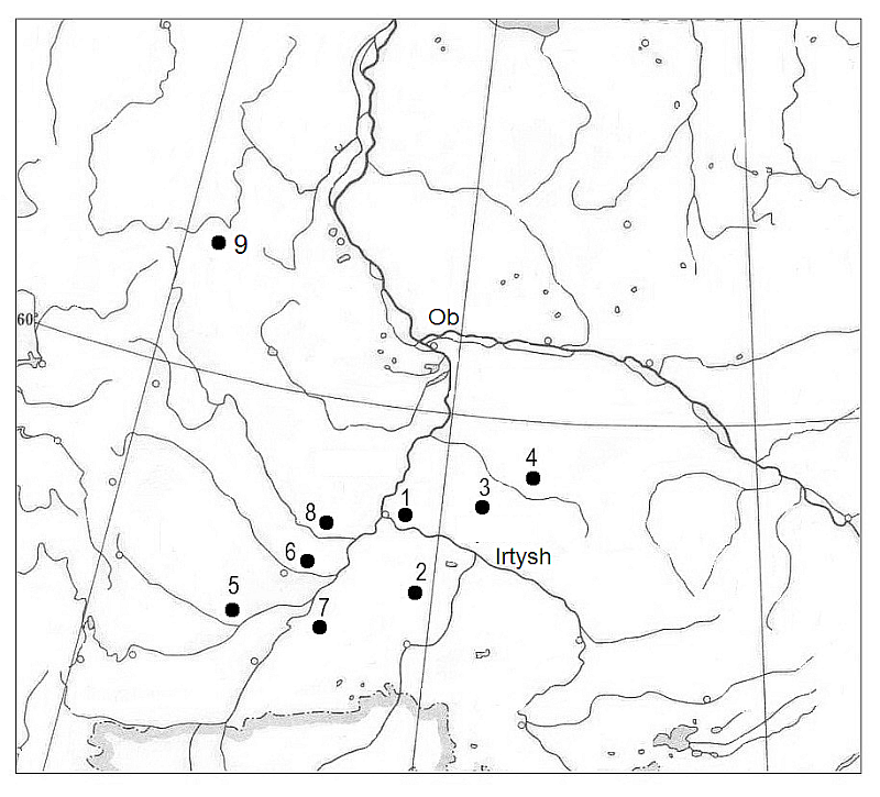 Fig. 1. Places of sample collection: 1 – Tobolsky, 2 – Vagaysky, 3 – Uvatsky, 4 – Nefteyugansky, 5 – Isetsky, 6 – Tyumensky, 7 – Yalutorovsky, 8 – Nizhnetavdinsky, 9 – Sovetsky areas of Tyumen Region