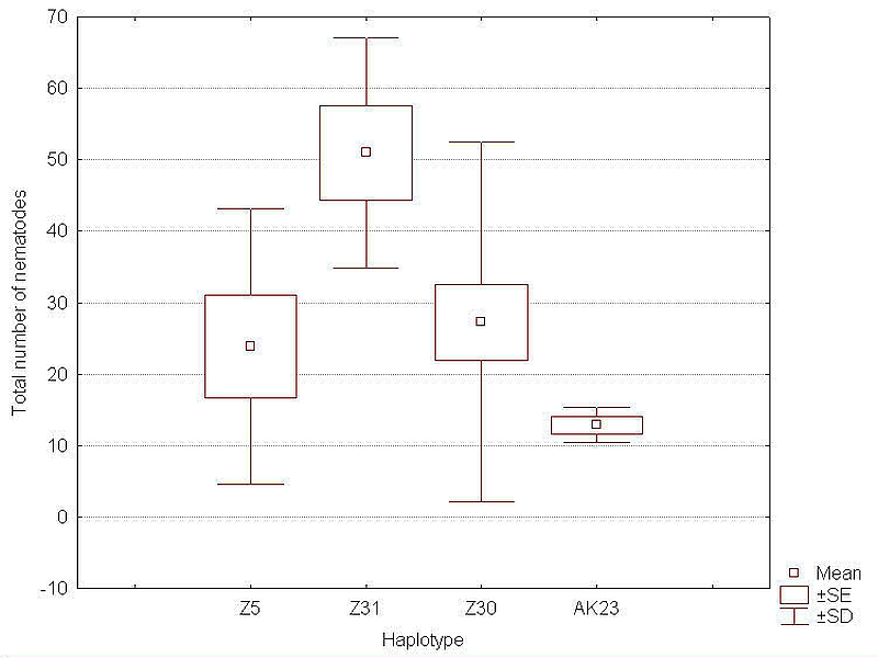 Table 4. Average number of helminths in mustelids with different mtDNA haplotypes (x ± SE)