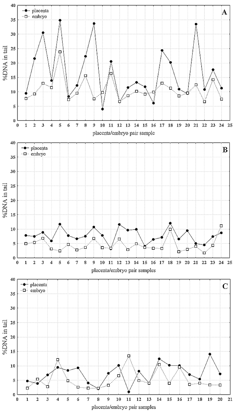 Введение Лесные и торфяные пожары - масштабное биосферное явление, служащие источником загрязнения воздуха сложной смесью продуктов горения растительной биомассы и органических отложений. Различные газы, полидисперсные твердые микро- и наночастицы и летучие органические соединения, образующиеся в этом процессе, рассматриваются как потенциально опасные поллютанты. Их воздействию подвергается все больше людей, поскольку масштабность природных пожаров в районах крупных мегаполисов возрастает, что определяет необходимость разработки соответствующих лечебных и профилактических мер, направленных на предупреждение и купирование патогенетических эффектов экспозиции дымами на здоровье человека [1, 19]. Эпидемиологические исследования свидетельствуют о поражениях дыхательной и сердечно-сосудистой систем, а также возникновении цереброваскулярных, гемостатических и репродуктивных нарушений у лиц, находящихся в зонах задымленности [1, 15]. Вместе с этим открытым остается вопрос о генотоксических эффектах и отдаленных генетически обусловленных последствиях воздействия задымлений. В предыдущих исследованиях было показано, что экспозиция торфяным дымом беременных крыс вызывает эмбриотоксические эффекты и нарушения постнатального развития у потомства. Анксиолитик афобазол, обладающий цитопротекторными, антитератогенными и антимутагенными свойствами, значимо снижал выявленные негативные эффекты [2, 3]. В экспериментах с экспозицией табачным дымом была показана сопряженность эмбриопротекторных и антигенотоксических эффектов афобазола [1]. Целью настоящего исследования явилась оценка поврежденности ДНК в клетках плацент и эмбрионов крыс, подвергнутых принудительной экспозиции торфяным дымом, и возможности их коррекции афобазолом. Материалы и методы Исследования проводили на беспородных белых крысах массой 240-270 г (питомник РАМН «Столбовая»). Животных содержали в условиях вивария ФГБНУ «НИИ фармакологии имени В.В. Закусова» при 12-часовом режиме на стандартном сбалансированном брикетированном корме, со свободным доступом к воде и пище, при естественной освещенности, температуре воздуха 20-21 °С. Все эксперименты проводили в соответствии с международными правилами (European Communities Council Directive of November 24,1986 (86/609/EEC)) и правилами работы с животными, утвержденными этической комиссией ФГБНУ НИИ фармакологии имени В.В. Закусова. Самцов и самок крыс ежедневно вечером ссаживали попарно в отдельные клетки. Утром после ссаживания у каждой крысы брали вагинальный мазок. Ссаживание прекращали при обнаружении сперматозоидов в вагинальных мазках. День обнаружения сперматозоидов рассматривали как первый день беременности. Животных с 1-го по 13-й день беременности подвергали принудительному ингаляционному воздействию торфяного дыма с использованием оригинальной установки в пластиковых камерах объемом 72 дм3. В камеры помещали по 5-6 животных одновременно. Задымление камеры проводили путем вдувания дыма от четырех последовательно сгорающих бумажных гильз (0,46 г каждая), наполненных смесью, состоящей из 70 % торфа и 30 % древесной массы (производитель ООО «Эксторф»). Время сгорания каждой гильзы составляло 6 минут, общий срок экспозиции торфяным дымом - 44 минуты. Афобазол (фармакологическая субстанция, синтезированная в НИИ фармакологии имен