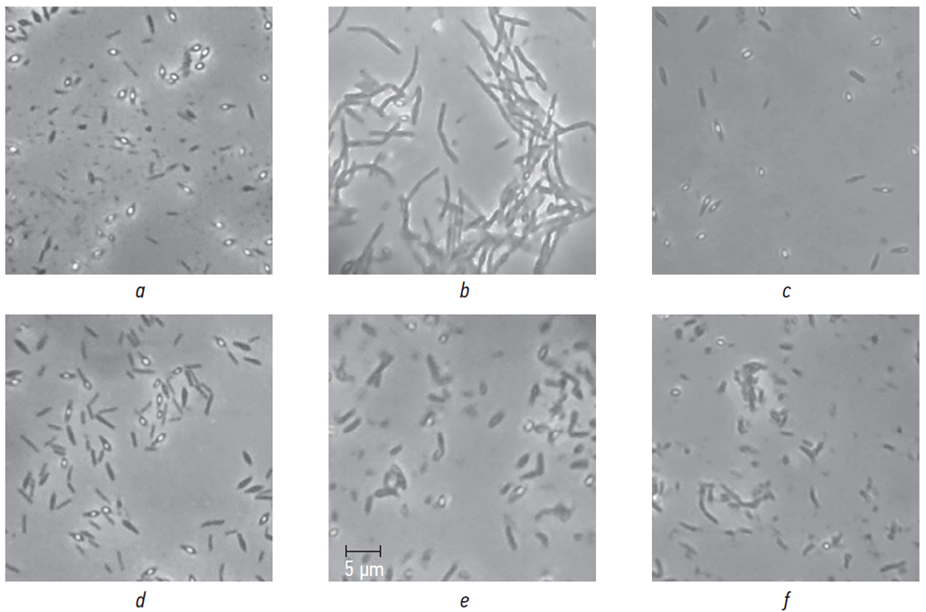 Fig. 1. General view of cells and spores: a – L1, b – L2-1, c – L2-2, d – L2-3, e – K2-2, f – K6