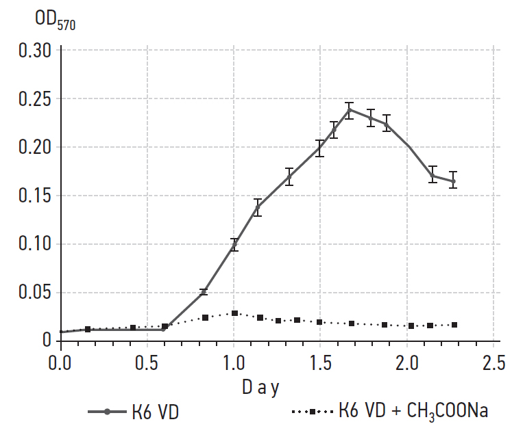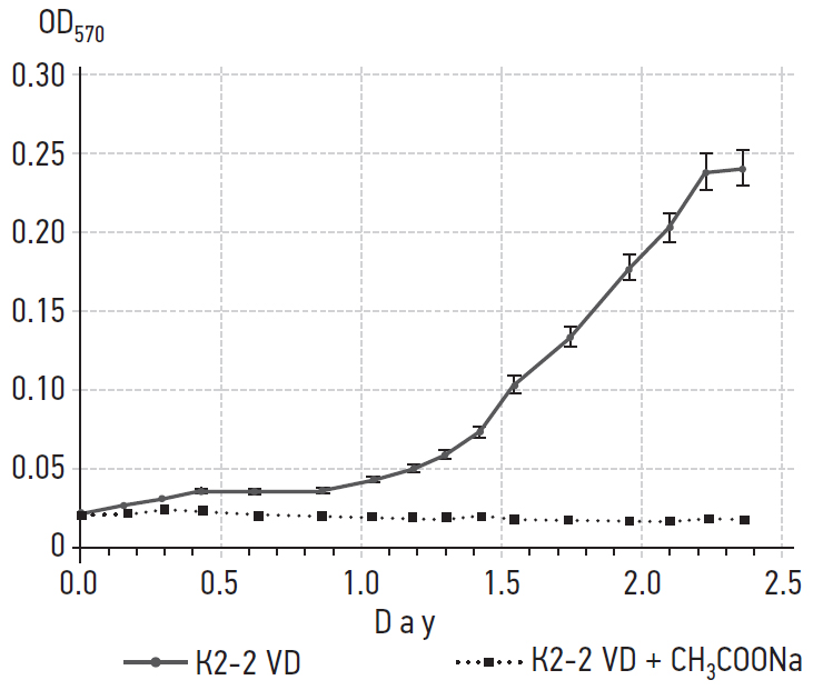 All isolated cultures were able to grow by using acetate as a source of energy and carbon. The growth dynamics of cultures K2-2 and K6 are demonstrated in Figs. 2 and 3. The maximum optical density (0.25 ± 0.012) was registered after 2–3 days for the K2-2 culture and 1.7 days for the K6 culture.