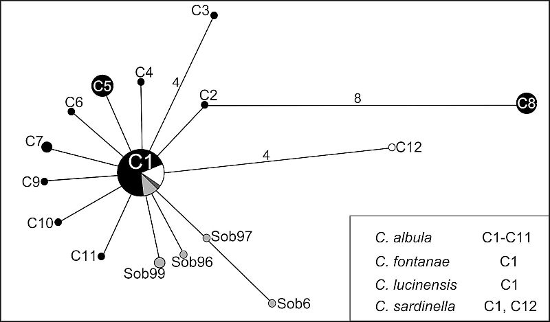 Интересно, что рассчитанные с использованием информации базы данных NCBI средние показатели внутривидовой дифференциации для C. albula составили для COI 0,5 и 1,2 % для ND1-фрагмента; в случае C. sardinella — 0,2 и 0,6 % соответственно. Уровень дивергенции между C. albula и C. sardinella равен для COI — 0,4 %; для ND1 — 1,0 %. В то же время оценки дифференциации между европейской ряпушкой и такими «хорошими» видами, как сиг C. lavaretus (Linnaeus), арктический омуль C. autumnalis (Pallas), чир C. nasus (Pallas) и другие в среднем составили для COI около 2,0 %, а для ND1 — 4,0 %.
