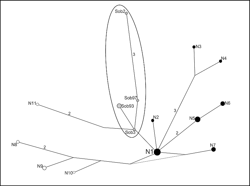 Для ND1-фрагмента ряпушки оз. Собачье описано четыре гаплотипа (Sob2, Sob3, Sob93, Sob97), один из которых (Sob93) был выявлен у двух особей из пяти, взятых в анализ. Гаплотипы ND1 исследованной популяции ряпушки образуют отдельную ветвь медианной сети (рис. 2). Следует отметить, что все пять особей, последовательность ND1-фрагмента для которых была определена, явились носителями гаплотипа Е по сайтам RsaI.
