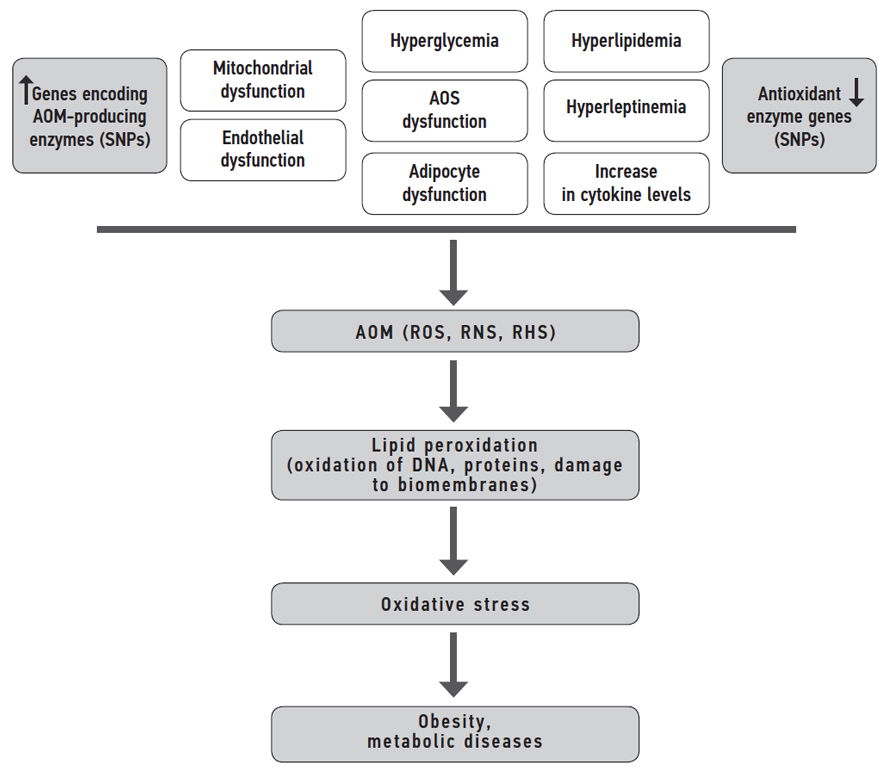 Thus, polymorphism in the genes for enzymes producing ROS, RNS, and RHS, makes a significant contribution to the development of OS associated with obesity and metabolic disorders. AOMs exhibit a dual role, at low concentrations they participate in regulatory signaling cascades in adipocytes and cells of other tissues, and at high concentrations, they cause cytotoxic effects and initiate the development of OS.